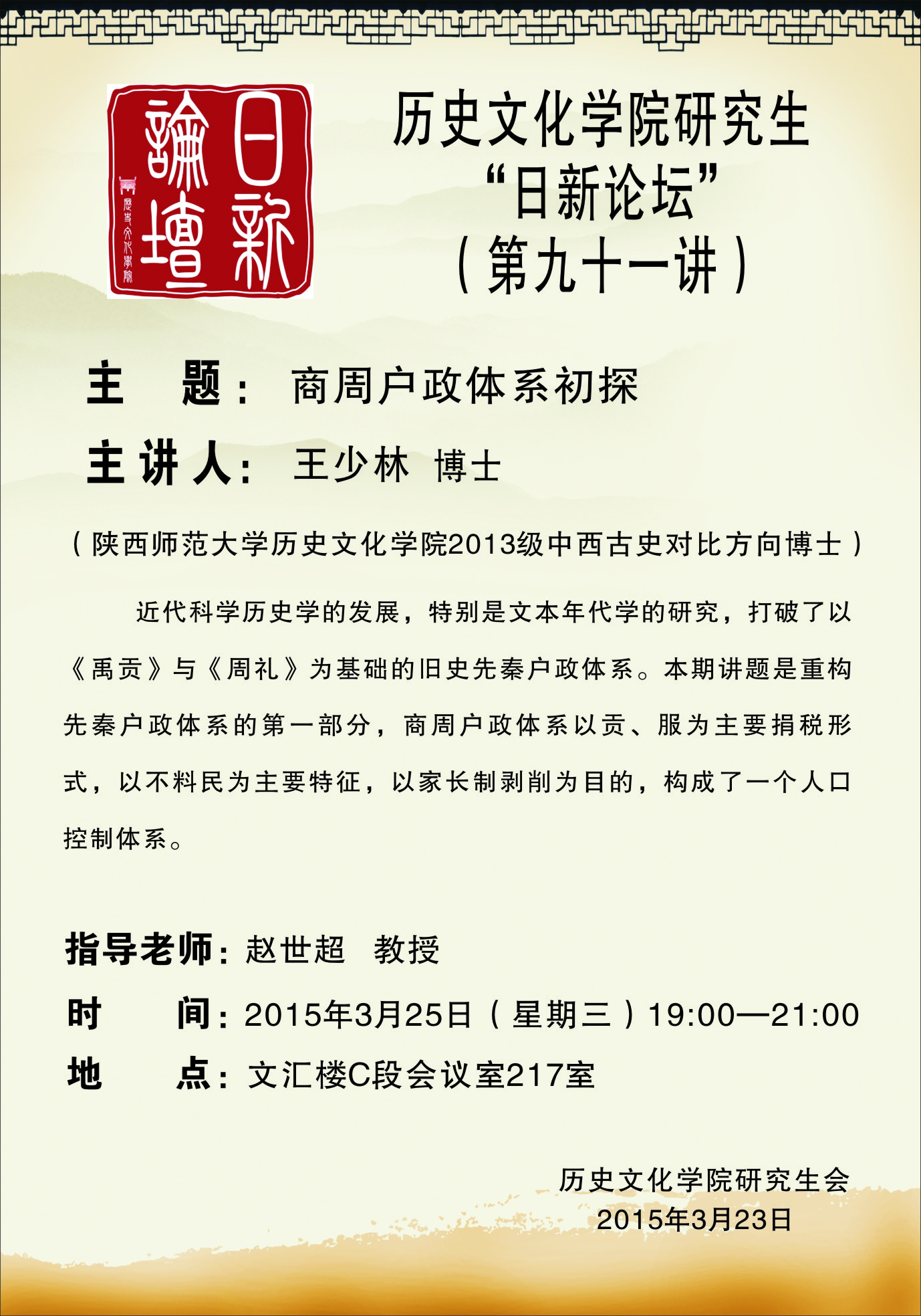 研究生日新论坛91讲预告