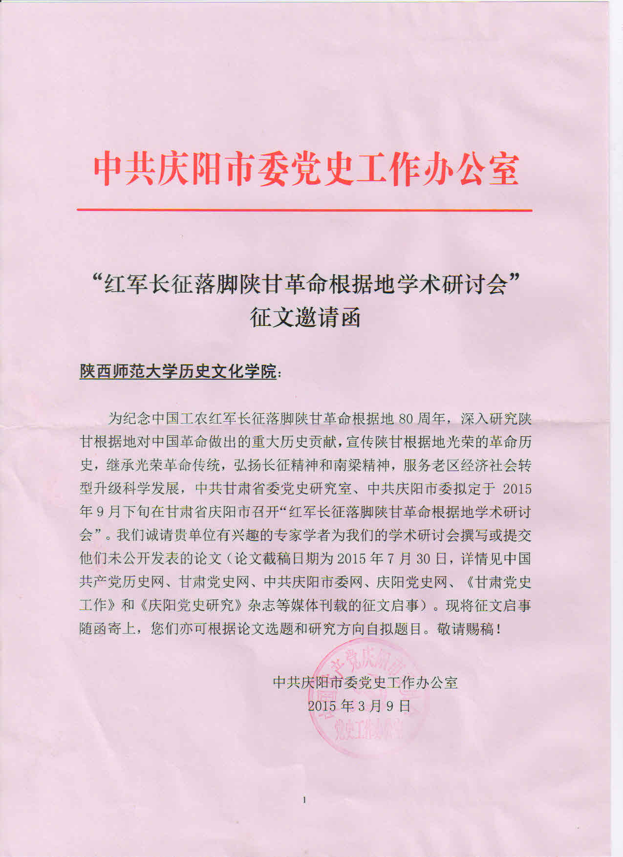 “红军长征落脚陕甘革命根据地学术研讨会”征文启事