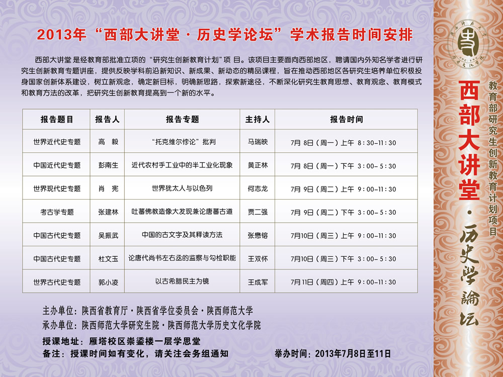 2013年“西部大讲堂•历史学论坛”学术报告时间安排