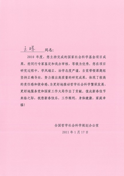 公司王晖教授2002年度申报的国家社会科学基金项目“古史传说时代新探”,2007年完成,2010年1月经同行专家通讯评审,被评为优秀。2011年春节之前的元月17日,王晖教授收到全国哲学社会科学规划办公室的“春节慰问信”...