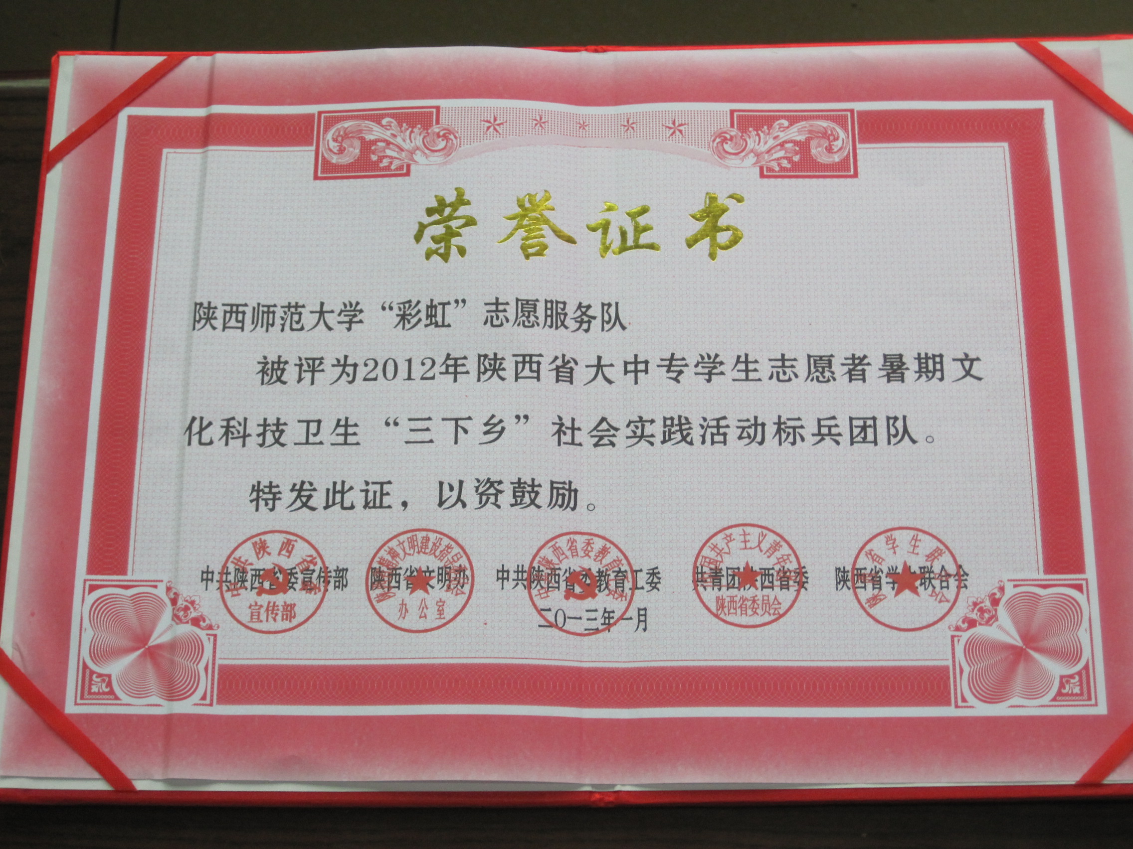 喜报 2012年暑期公司团委响应校团委以“青春九十年,报国永争先”为主题的老员工暑期文化科技卫生“三下乡”社会实践活动号召,组织了“彩虹”志愿服务队,于2012年7月暑假,至陕西省渭南市华县高塘镇北村中心小学,...