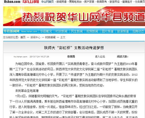 公司第二届“彩虹桥”支教活动受到人民网等媒体广泛关注 (通讯员:刘东)2013年7月12日-7月21日,太阳成集团tyc33455第二届“彩虹桥”暑期支教实践团队深入渭南华县高塘镇北村中心小学,开...