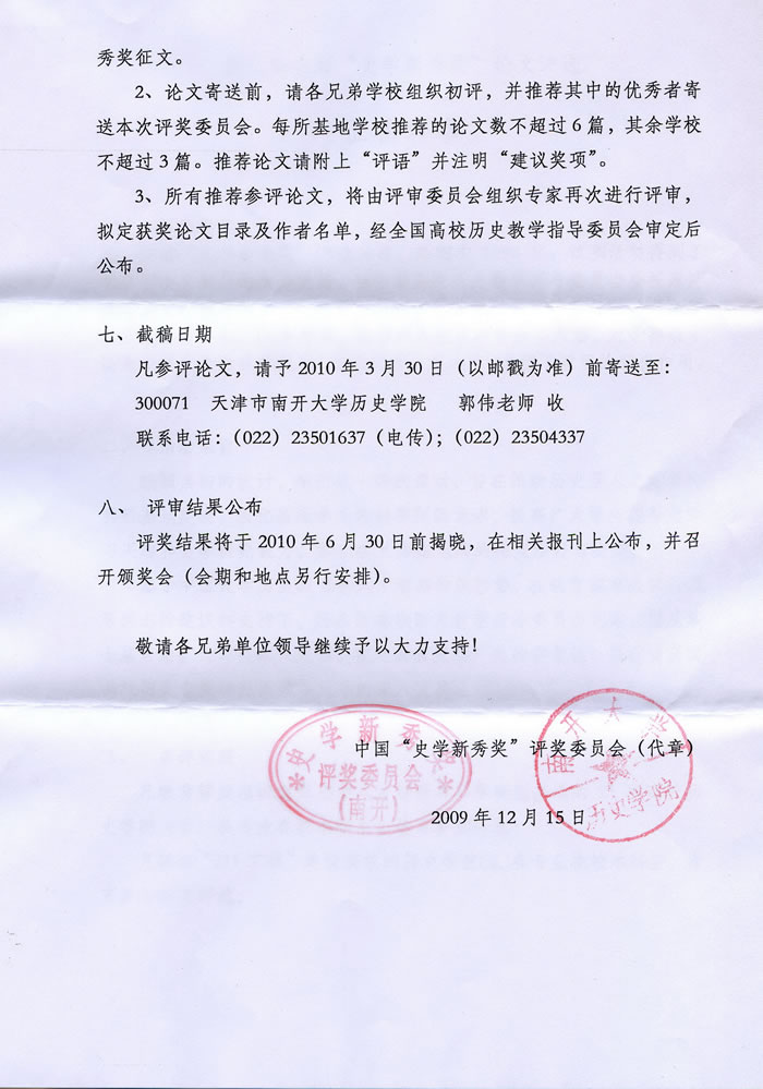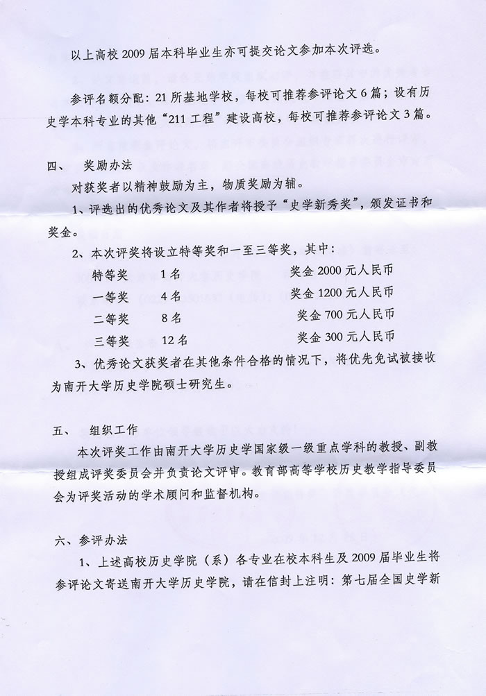 根据《第七届全国“史学新秀奖”论文评选征稿启事》,从今年起,该奖项首次扩展到公司,给有3个参评名额。根据公司员工的实际情况,经研究决定,3个参评名额分配如下:2009届(2005级)2个;2010届(2006级)和2011届(2007级)1个。