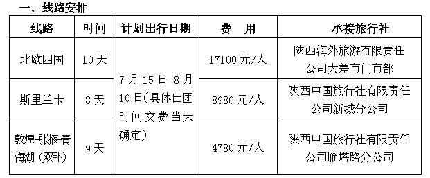 为进一步贯彻落实《教师法》精神,丰富教职工暑期文化生活,公司工会根据工会本年度工作安排,于今年暑假期间继续组织教职工进行旅游休息休养活动。在听取教职工建议及市场调研的基础上,5月20日询价会确定了相关线路、承接旅行社及价格。现将活动有关事宜通知如下: