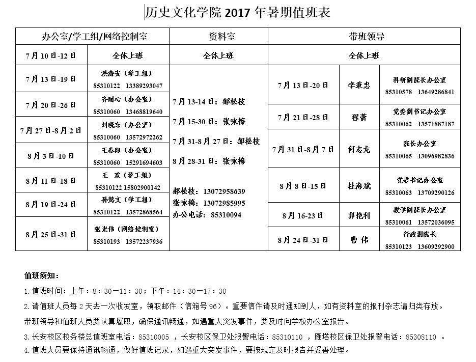 太阳成集团tyc334552017年暑期值班表
