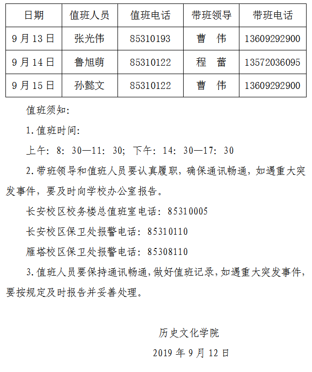 2019年中秋节值班安排