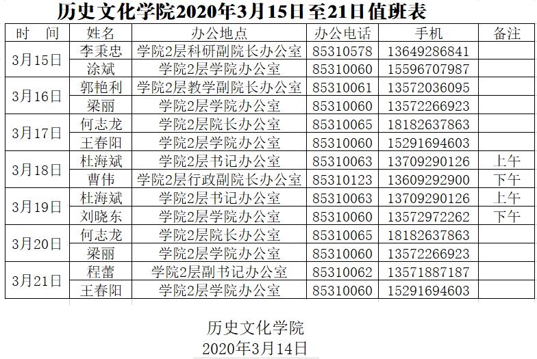太阳成集团tyc334552020年3月15日至21日值班表