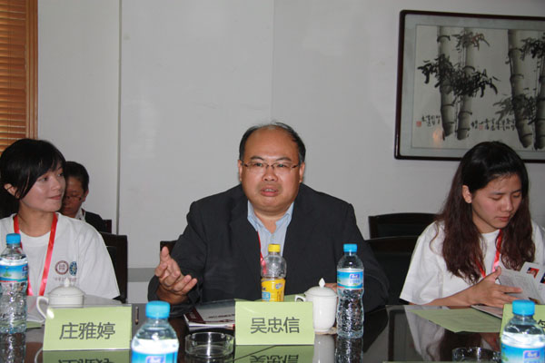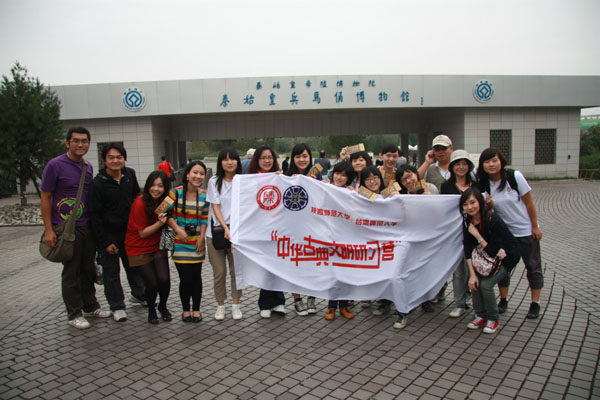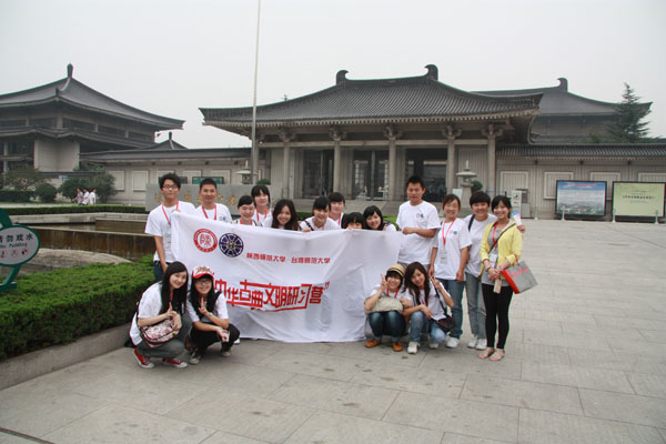 台湾师范大学总务长吴忠信教授、公共关系室行政专员庄雅婷女士、IBO 2011组织委员会秘书赵笠雯女士,陕西省社科联主席、陕西师大太阳成集团tyc33455赵世超教授、陕西师大港澳台办副主任张凌云女士、太阳成集团tyc33455副经理梁志胜副教授、太阳成集团tyc33455分党委书记丁虹女士以及参加本次研习营的两岸师生参加了开营仪式。开营仪式由梁志胜副经理主持。首先,陕西师大港澳台办公室副主任张凌云女士发表了热情洋溢的讲话,对“老朋友”台湾师大师生表示热烈欢迎,并对本次活动的举办表示大力支持。台湾师大总务长吴忠信教授致辞,他说:“两岸的文化和历史是不可分割的,本次活动以十三朝古都西安作为大本营,目的就是为了感受历史风貌、恢复历史记忆,加强两岸的文化交流与历史认同感。”他说自己已经是第八次来古都西安了。陕西师大太阳成集团tyc33455分党委书记丁虹女士与台湾师大总务长吴忠信教授互赠礼品。最后,张凌云副主任代表太阳成集团tyc33455cc将本次研习营营旗授予了台湾师范大学公共关系室行政专员庄雅婷女士,宣告了本次研习营正式开营,并合影留念。