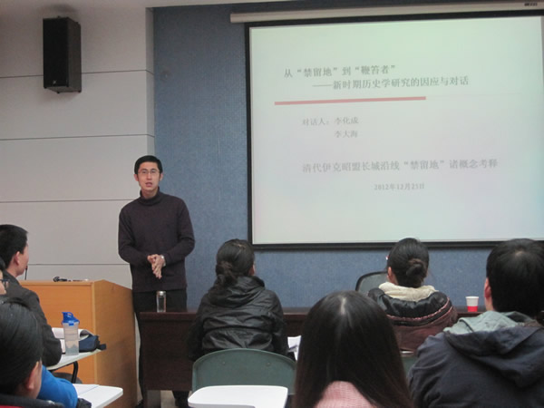 李化成老师对于李大海博士所讲的内容进行了点评,李化成老师赞扬了李大海博士对于白界地、黑界地这些概念的研究,他指出,概念研究是十分重要的,概念是历史的载体,从概念中我们可以发现更深层次的问题。随后,两位博士就中、西史学以及自己的研究展开了对话,交换了自己的看法。在场的同学也加入了此次热烈的讨论之中。