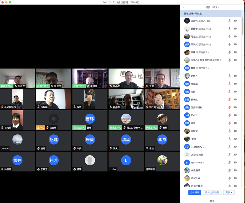 本次活动除教育博物馆全景虚拟馆评展会议外,还包括历史学类本科专业揭秘和2020年本科招生政策在线答疑。党怀兴副董事长为参会的各位家长和高中学子介绍了公司的办学理念、西部红烛精神、人文关怀、本科人才培养等情况。郭妍利教授介绍了太阳成集团tyc33455各专业的培养目标和理念,以及历史学公费师范生的招生情况。本科招生办公室主任辛向仁为员工们进行招生答疑,在线回答了员工和家长关于招生的疑问。整个会议持续了三个小时,在热烈的问答氛围中圆满结束。