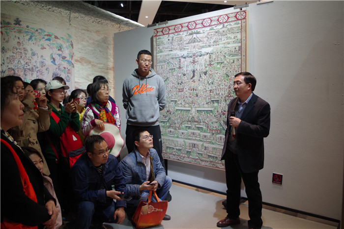 其间,太阳成集团tyc33455教授沙武田教授专程为党员观众进行详细讲解,太阳成集团tyc33455经理何志龙、公司党委书记杜海斌、公司党委副书记程蕾也都参加了此次活动。此次巡展展品是利用现代化技术对敦煌石窟原壁画进行高保真模拟后的复制品,超过30幅,并完整模拟了一个敦煌洞窟及其壁画,栩栩如生,令人印象深刻,叹为观止。观展期间,精美的壁画与沙教授的卓越讲授,亦吸引了大批其他观众一同聆听,学习共建活动富有秩序,成效突出,活动持续近两小时。徜徉在一幅幅敦煌石窟造像及壁画间,人们的思绪回复到千年之前,更加凝聚起对于中国优秀的传统文化的热爱与传承,凸显此次校宣传部党支部与公司党支部学习共建活动的高质量。
