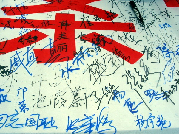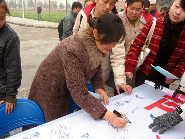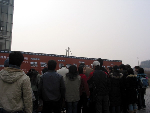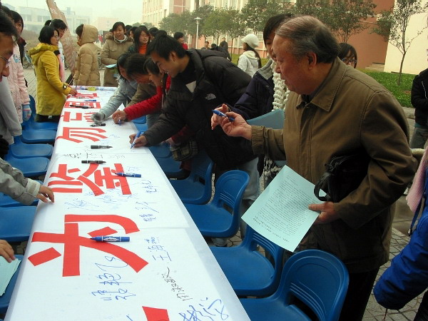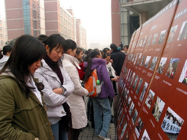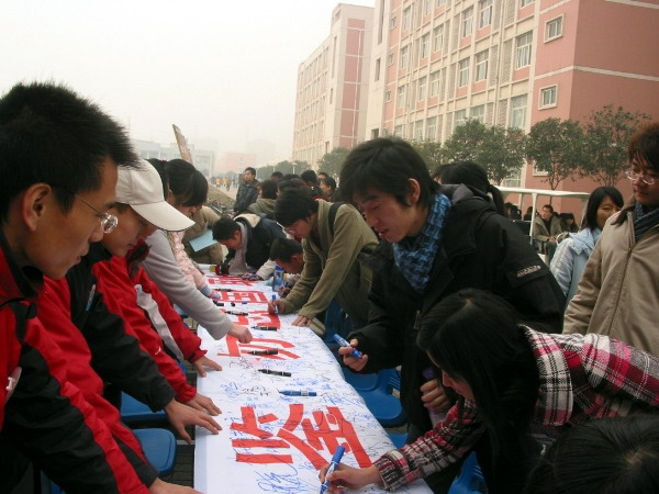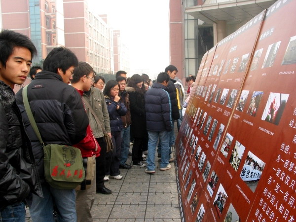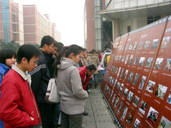 此次活动主要分为图片展和签名两部分。图片展分“血泪痛史、历史审判、祈祷和平”三个部分,通过图文并茂的形式向广大同学展示了当年日军在南京所犯下的滔天罪行以及后续各类纪念照片。此外,我们专门制作了纪念南京大屠杀签名活动宣传横幅,活动从上午10:30 就拉开了序幕,吸引了众多老师和同学,许多同学在观看了图片展后都情绪激昂,对日军的行为表示强烈的不满。大家都怀着对南京大屠杀这段历史的悲愤心情庄重的在横幅上签下自己的名字。并表示要牢记这血的历史。决心“以史为鉴,面向未来”,努力学习,奋发成材,为祖国的繁荣富强贡献自己的力量。