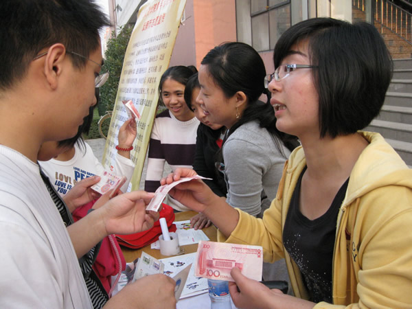 这次活动的主要内容为宣传识别假币、普及使用和保护人民币的相关知识。活动期间,志愿者们就同学们关心的有关人民币的鉴别、保护、使用过程中应注意的问题以及相关问题,作了详细解答,并且向同学们散发了辨别假币的相关资料。活动中,同学们表现出了极大的热情,与志愿者积极交流。