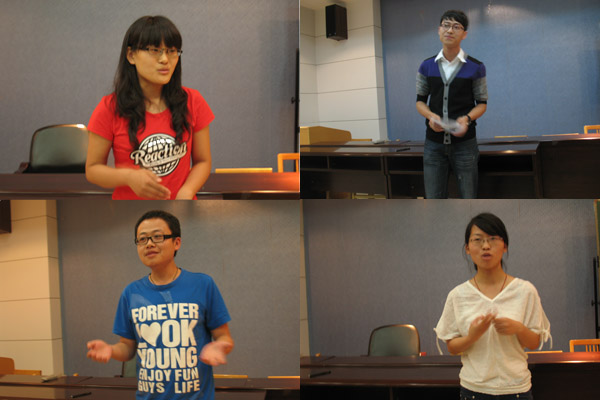 19时30分会议正式开始。首先,柴永昌老师简要说明了会议流程和竞选方式,并预祝参选同学竞聘顺利。随后,参加选聘的同学们一一登台,发表竞选宣言。他们个个精神抖擞,畅谈自己对竞聘岗位、对研会甚至学习和生活的理念与诉求。竞选者的个性在此充分体现:付林的沉稳持重、孙巍的风趣幽默、马哲的沉着内敛、吴媛的健谈诚恳……每位竞选者发言完毕后,柴老师和研会现任干部们则会提出一些问题,作以进一步针对性的考察。在当晚的18位参选者中,王春阳同学可谓是竞选积极性最高的。他不仅为竞选准备了个人的介绍性资料,并将其复印数十份发放给在座的师生,还在发言过程中提出了非常细致的竞选纲领和当选目标。他的用心程度赢得了在座师生的一片好评。