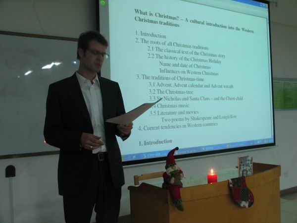 克里斯汀博士此次受邀举办讲座,主要就是围绕着圣诞节的起源、产生背景、与基督教的相互关系和它的发展变化,以及在西方文化史中的地位和作用。对于圣诞文化在世界各地的传播和影响,克里斯汀表达了自己的看法,他认为这是世界文化互相传播、融合的表现。他生动形象、深入浅出、旁征博引的讲说给到场师生留下了深刻印象。