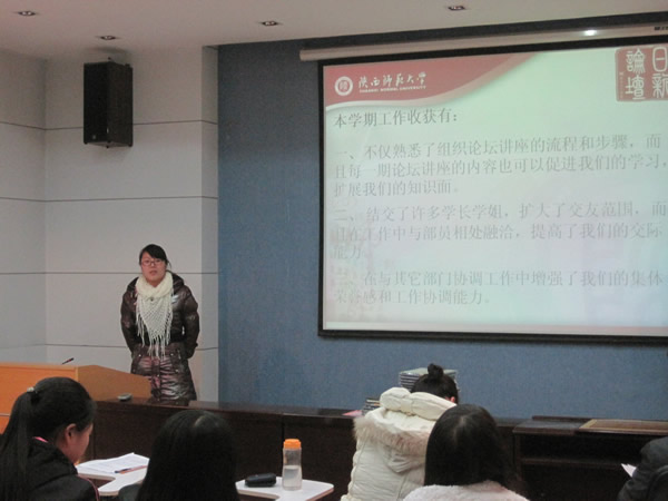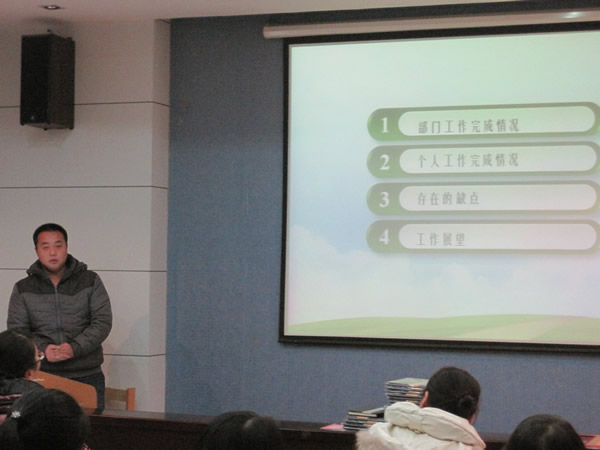 首先,研会主席秦琼对研会工作做了总结,指出公司研究生会以第二名的成绩荣获校优秀研究生分会是对公司研会工作的肯定;接着,他回顾了本学期研究生会在以“服务研究生成长成才”宗旨下开展的各项工作,主要包括多层次的学术交流活动、有针对性的实践活动、有益身心的文体活动、研会自身建设,他充分肯定了研会一学期以来的成绩,同时指出工作中存在的问题。其次研会各部部长依次向全体成员就本学期工作情况做述职报告,肯定成绩、总结得失、展望未来。再次,柴永昌宣读了获得研会先进个人、优秀干部、优秀部门名单并颁发荣誉证书及奖品。接着,研会先进个人代表朱闪发言。