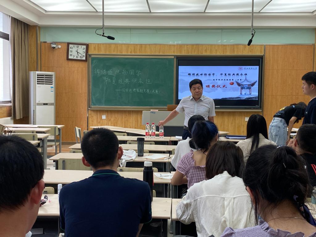 八组选手比赛完毕后,张文安老师进行了总结发言,他认为此次活动能够引起各位同学对传统文化的关注,通过这一活动展现出了各位研究生的知识积淀和演讲风采,并希望能够将在此次比赛中学习到的内容和展示出的面貌融入到之后的学习生活中去。随后,他为获得本次比赛一、二、三等奖的小组代表颁奖。