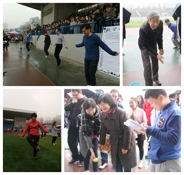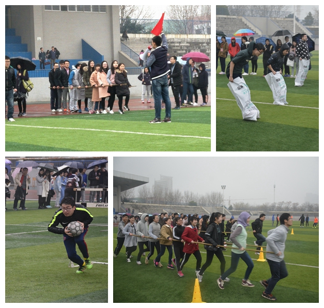 公司2017年春季运动会本着趣味体育的原则,在原有的激烈比赛中涵括开心元素,使运动会全程充满欢乐愉快的氛围。其中个人赛有踢毽子、跳小绳、小球投准和仰卧起坐;团体赛有负重接力、袋鼠跳、接力游戏、和谐号动力火车和跳大绳。各类比赛项目在绵绵细雨中紧锣密鼓地有序进行,雨水浇不灭运动健儿们的熊熊烈火,真有“春风吹,战鼓擂,史院师生谁怕谁”的运动气势,运动员们以饱满的精神风貌进行着一场又一场的比赛,如同下起的小雨跳动在操场上挥洒着青春与活力。