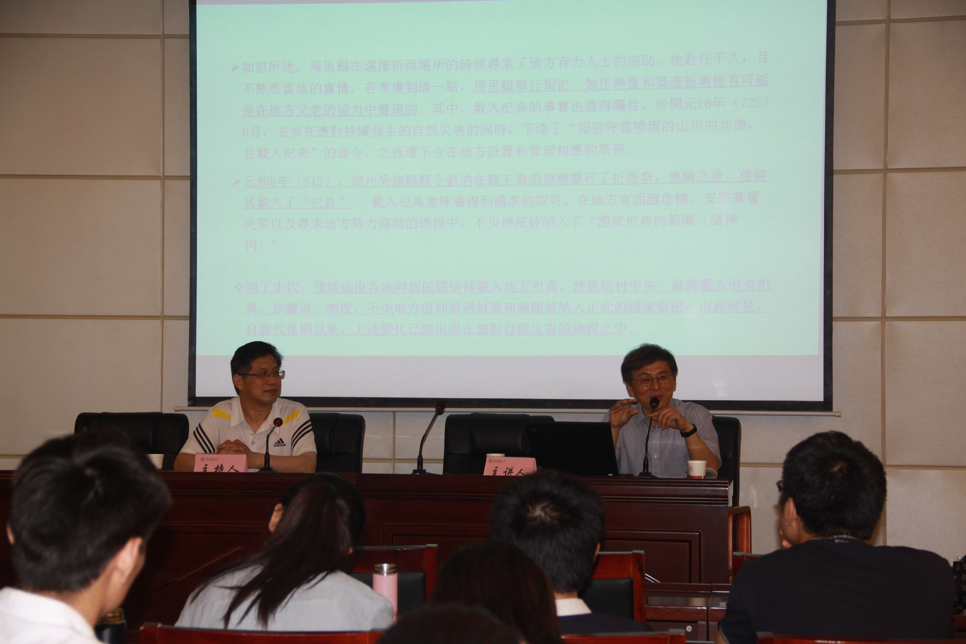 此次讲座内容共分为三个部分:第一部分金相范教授从中国民间信仰的社会功能与特点谈起,介绍了中国民间信仰的社会功能,即维持中国社会的保守性、强化基层社会的道德价值、提供精神上的安慰。并分析了中国民间信仰的主要特点是分散性的宗教、现实性宗教信仰、混合性宗教信仰。另外分析了唐代国家祭祀与“地方祭祀”的不同。第二部分讲了唐代国家祭祀中相关自然灾害的运营,其中对自然灾害与国家礼典进行了分析,并对相关自然灾害地方祭祀的事迹运用状况列举了史籍与出土文献中的材料来举例说明。第三部分讲了自然灾害与民间信仰。其中就地方官的苦恼与选择进行材料分析,得出地方官通过与地方有力人士之间的直接交流和对话来寻求地方社会的协助是解决问题的上策。