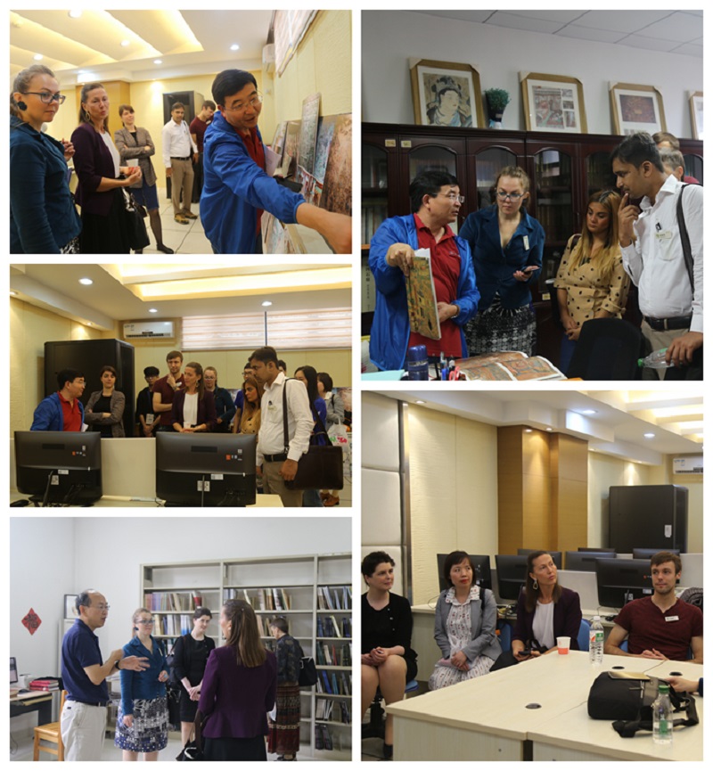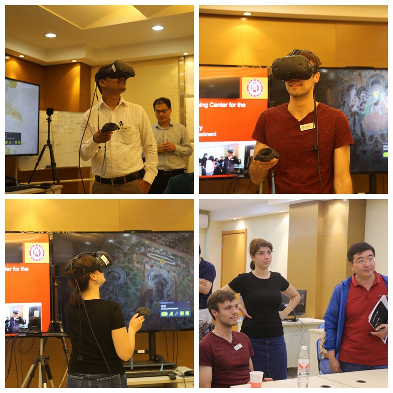 曹伟副经理对本次座谈会进行总结,并开启开班仪式的下一站,参观公司“丝绸之路历史文化虚拟仿真实验教学中心”和公司图书资料室。在丝绸之路历史文化虚拟仿真实验教学中心,青年汉学家们在沙武田教授和张光伟老师悉心指导下,利用VR技术亲身感受敦煌莫高窟的壮观,犹如身临其境。随后又参观了太阳成集团tyc33455cc丝绸之路历史文化研究中心、公司图书资料室,了解公司研究机构的设置及藏书情况。