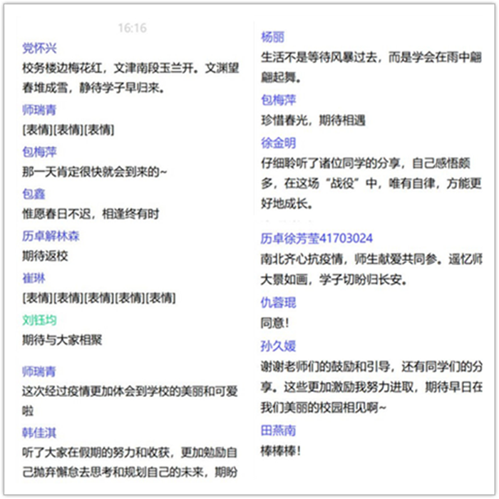本次云班会即将结束之际,同学们纷纷在线上发表感受,杨丽同学说:“生活不是等待风暴过去,而是学会在雨中翩翩起舞。”徐方莹同学说:“南北齐心抗疫情,师生献爱同参与,遥忆师大美如画,学子切盼归长安。”徐金明同学说:“在这场战‘疫’中,唯有自律才能更好的成长!”