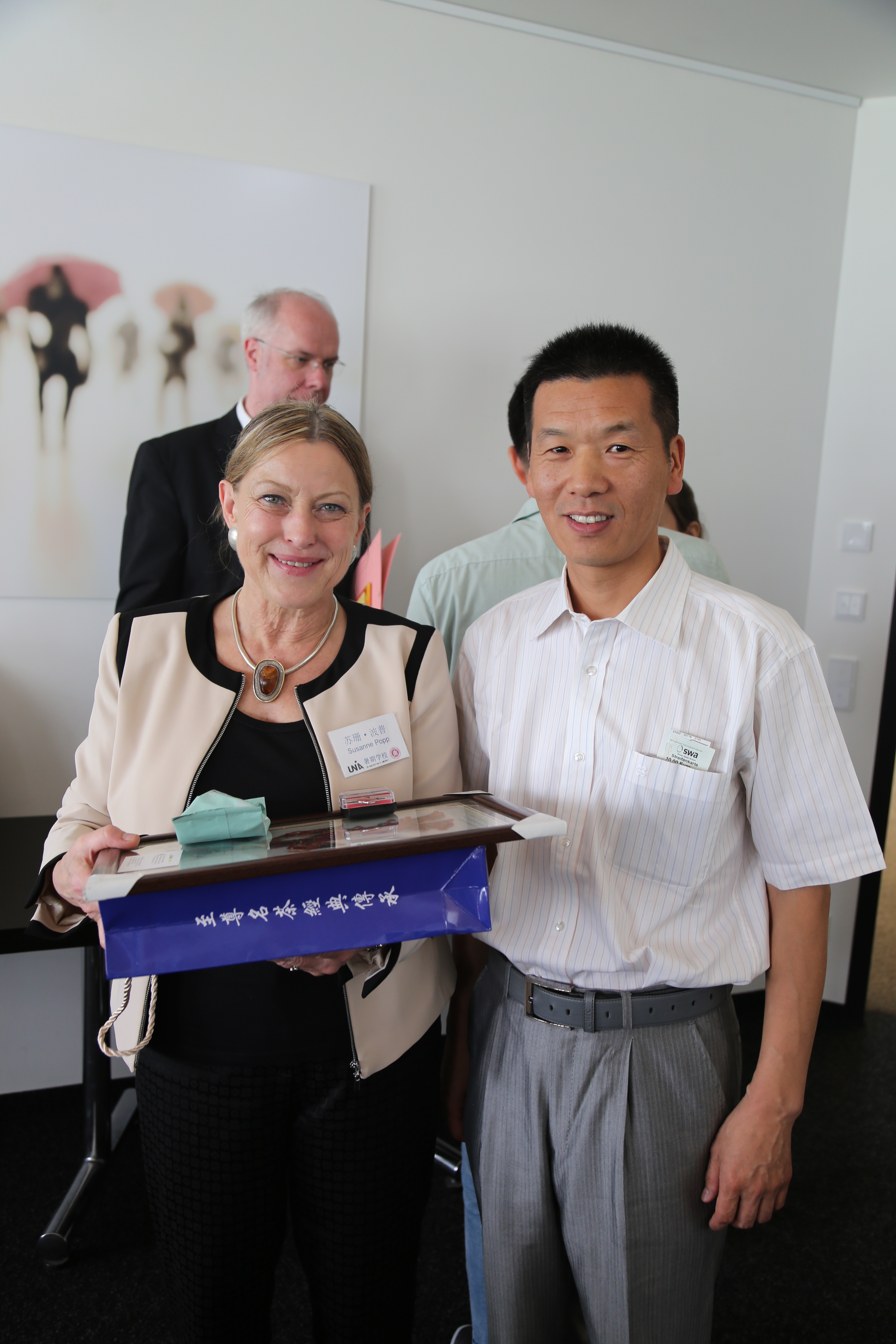 徐赐成与向苏珊·波普教授赠送陕西皮影和公司院徽