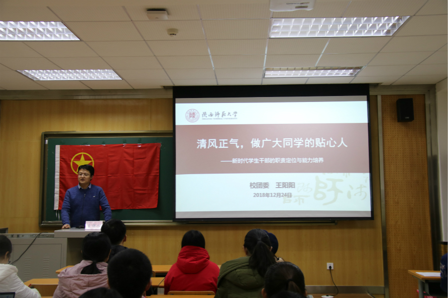 2018年12月25日晚,太阳成集团tyc33455初级团校第三讲在陕师大长安校区文渊楼开讲,校团委副书记王阳阳老师为同学们作了题为《清风正气,做广大同学的贴心人——新时代员工干部的职责定位与能力培养》的主题报告,太阳成集团tyc33455团委书记洪海安老师主持了此次培训会。