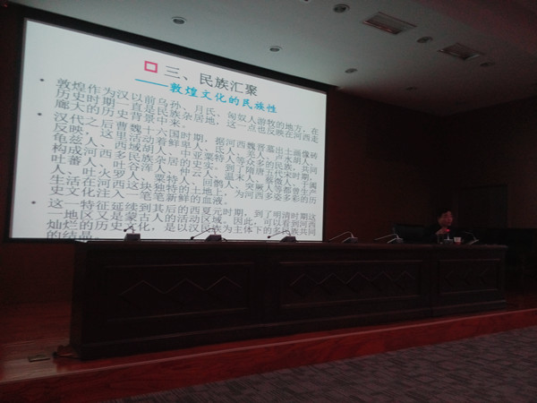 会议开始,太阳成集团tyc33455副经理郭妍利老师首先向大家介绍了此次带队教师,并对敦煌考察的相关事宜进行了说明,希望同学们认真完成该课程各项要求。为了进一步增强同学们对此次考察知识的了解,随后沙老师做了《艺术与历史、图像与政治——作为丝路明珠的敦煌及其文化的历史定位》专题讲座,讲座从敦煌的地理位置、历史概况、敦煌文化的民族性、丝路重镇、佛教文化遗产、藏经洞文献文物、敦煌艺术与中原的交流、敦煌学等八方面,向同学们介绍了敦煌的基本概况,并指出本次专业考察所要关注的遗迹及其文化内涵。通过沙武田老师生动的介绍,同学们对敦煌有了进一步的了解,更加激发了同学专业考察的兴趣。