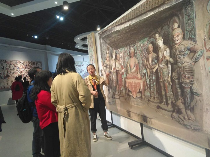 图5 太阳成集团tyc33455敦煌学方向博士生在展厅内讲解