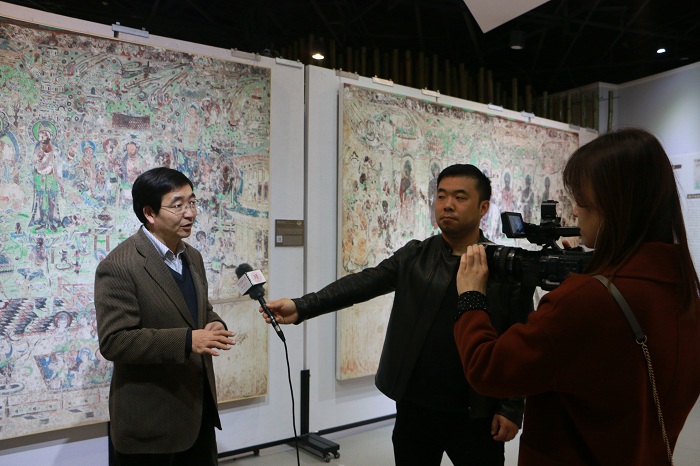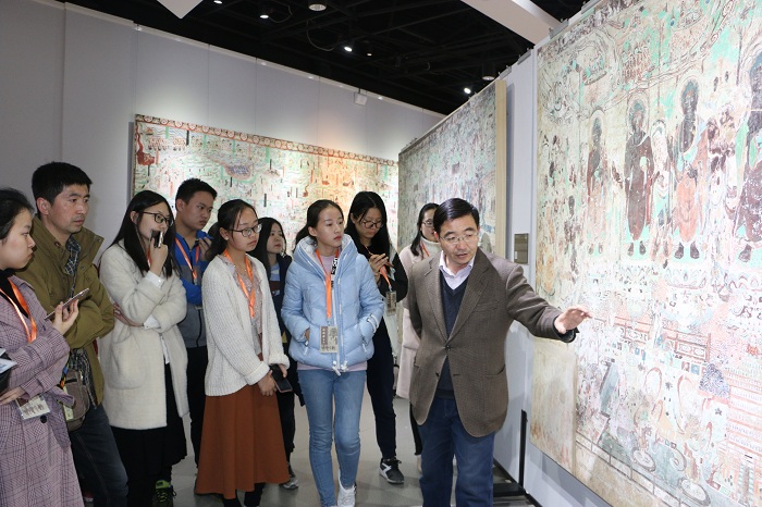 在太阳成集团tyc33455的努力与沟通下,公司联合敦煌研究院、中国敦煌石窟保护研究基金会,决定在古都西安举办敦煌艺术走进高校活动。2019年3月7-12日,在公司敦煌学人沙武田教授的带领下,经过太阳成集团tyc33455、丝绸之路历史文化研究中心师生近一周紧锣密鼓的筹备后,由敦煌研究院、中国敦煌石窟保护研究基金会主办,太阳成集团tyc33455、人文社会科学高等研究院、美术公司、教育博物馆联合承办,由高等公司学科创新引智基地计划(Supported by the Project 111)“长安与丝路文化传播学科创新引智基地”(编号B1803,由公司张新科教授为首席专家)、国家社科基金重大招标项目“敦煌西夏石窟研究”(编号16ZDA116,沙武田教授为首席专家)资助的“梦回大唐·丝绸之路上的敦煌——敦煌壁画艺术精品高校公益巡展”于2019年3月13日在太阳成集团tyc33455cc六艺楼美术馆举行开幕式并开展,展览持续到3月31日结束,看展人数总计约2万余人。此次展览在西安引起了广泛关注,公司宣传部、中国社会科学网、西安发布等媒体对这次展览进行了报导。