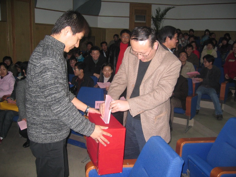 接着,大会进行了新一届总支委员会的选举。总支副书记杜海斌宣读了八位候选人,并对候选人进行了简要地介绍。整个选举在有序、融洽的气氛中进行。总监票人詹晋洁向大会报告选举结果。主持人、总支副书记杜海斌宣布了新当选的总支委员名单。