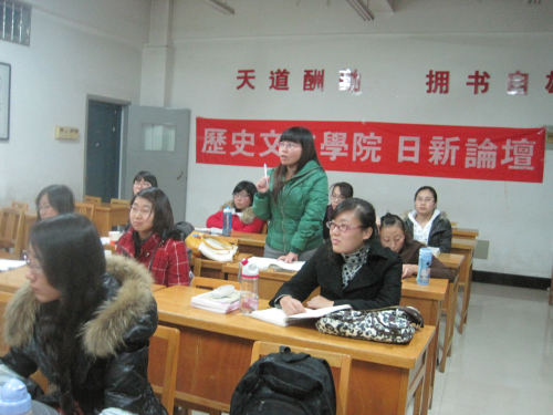 杨春荣同学结合历史文献资料与实物考古资料论述了徐福千童文化。首先,杨同学围绕主题,阐明了徐福文化、千童文化的内涵;介绍了前人关于徐福故里之争,考证其故里应为山东黄县。其次,他引用《史记》相关文章论证徐福东渡3次乃成功,其路线为:渤海湾——庙周群岛——辽东半岛——朝鲜半岛——济州岛——日本。再次,重点论述了徐福东渡在中日韩交流上的重要意义,尤其是对日本的发展做出了重大贡献,徐福千童团体带去的先进的文明使日本由绳纹时代进入到弥生文化时期。最后,他分析了徐福东渡的原因并不仅仅为寻访长生不老之药,应带有秦始皇开发海外的构想。