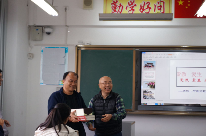 11月3日八点,同学们前往天水一中,与中学展开了交流和考察学习。在夏继荣老师的主持组织下,开展交流活动。张聿军老师提出了作为教师的三个要求——爱教、爱生、爱校,并分享了自己的一篇文章《中学历史教学:想说爱你不容易》,强调了教学创新的重要性;顾乐老师作为青年教师,分享了初为教师遇到的问题,以及该如何适应教学和如何增加课堂趣味性;倪丽侠老师则谈了大学师范学习与中学历史教材的衔接、教学理论与实践相结合的问题。三位老师们的经验与心得让同学们受益匪浅。最后,为了向天水一中的老师们表达谢意,梁志胜老师代表公司向夏继荣老师赠书。