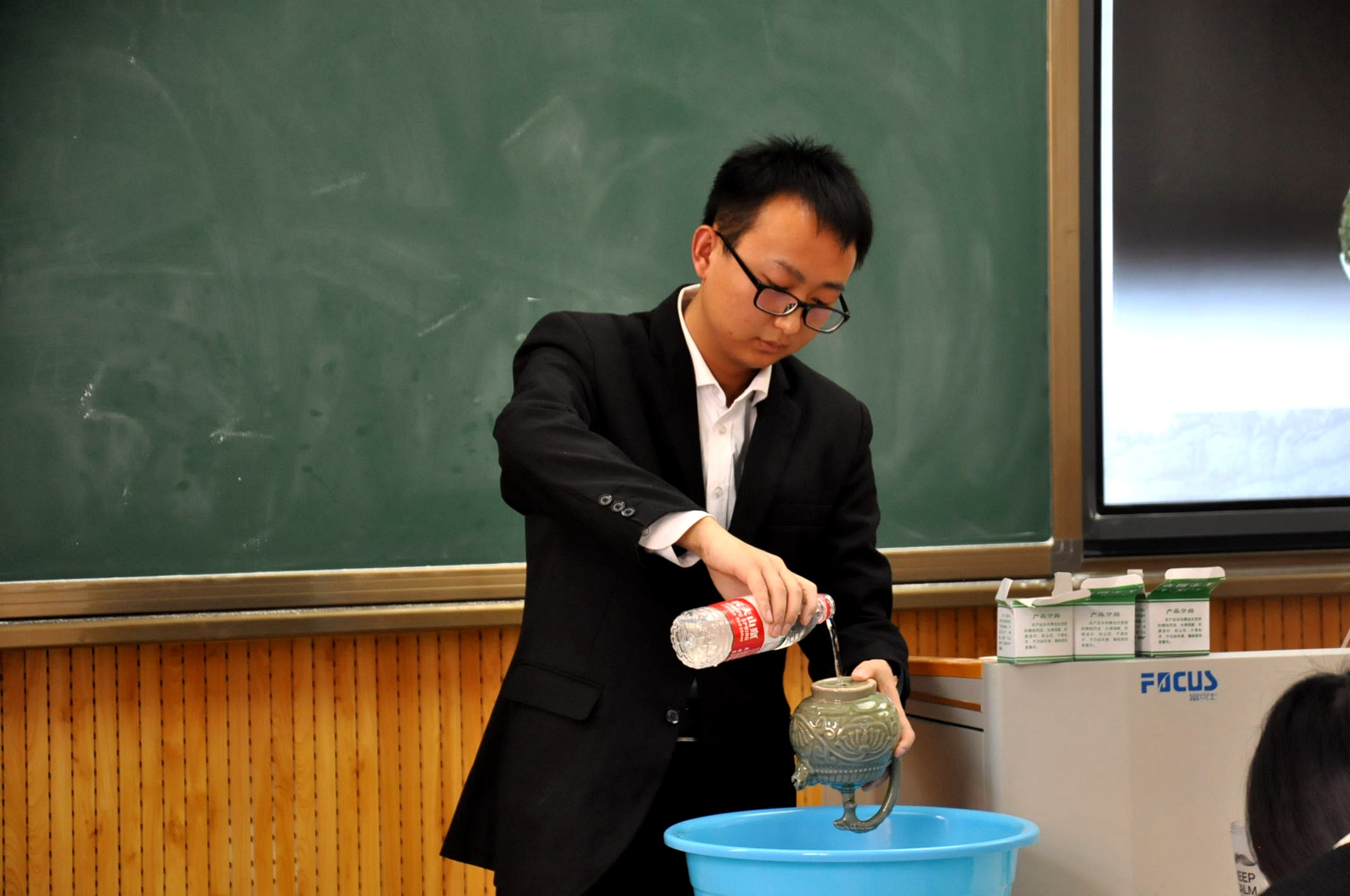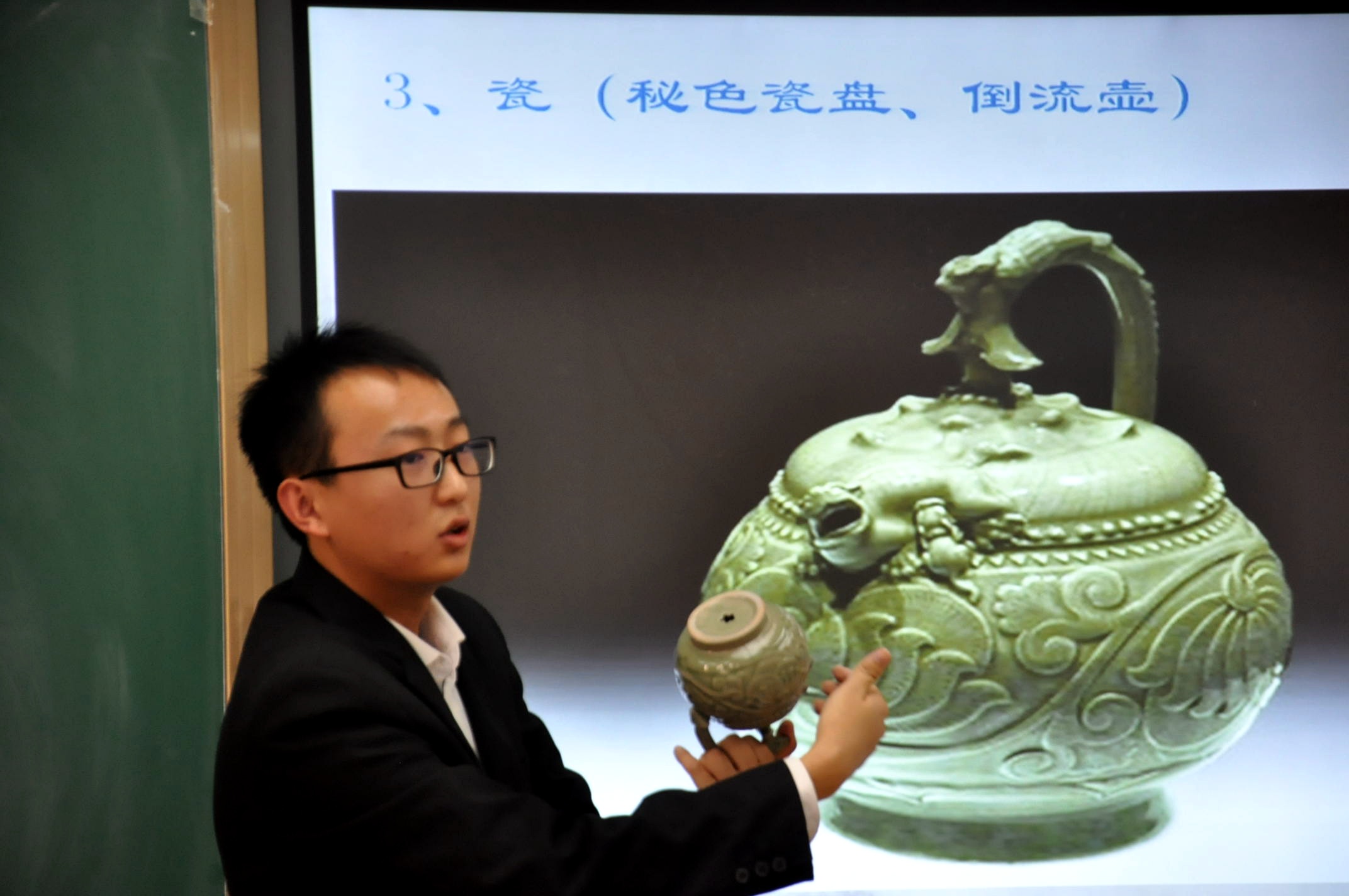 齐俊杰同学以陕西地形图为导引,从衣、食、住、行以及精神信仰五个方面介绍了博物馆与人们生活的密切联系,用有趣、活泼的语言将文物的渊源娓娓道来。每一个方面的讲解以文物所属年代为顺序,由浅入深,全方位展示人们衣食住行的发展和演变。在讲课过程中,主讲人充分利用幻灯片将音乐、图片与所讲内容相结合,在讲述文物与人们饮食的关系时,用道具进行现场演示,让在座同学直观、深刻地了解到传统文化的丰富内涵。