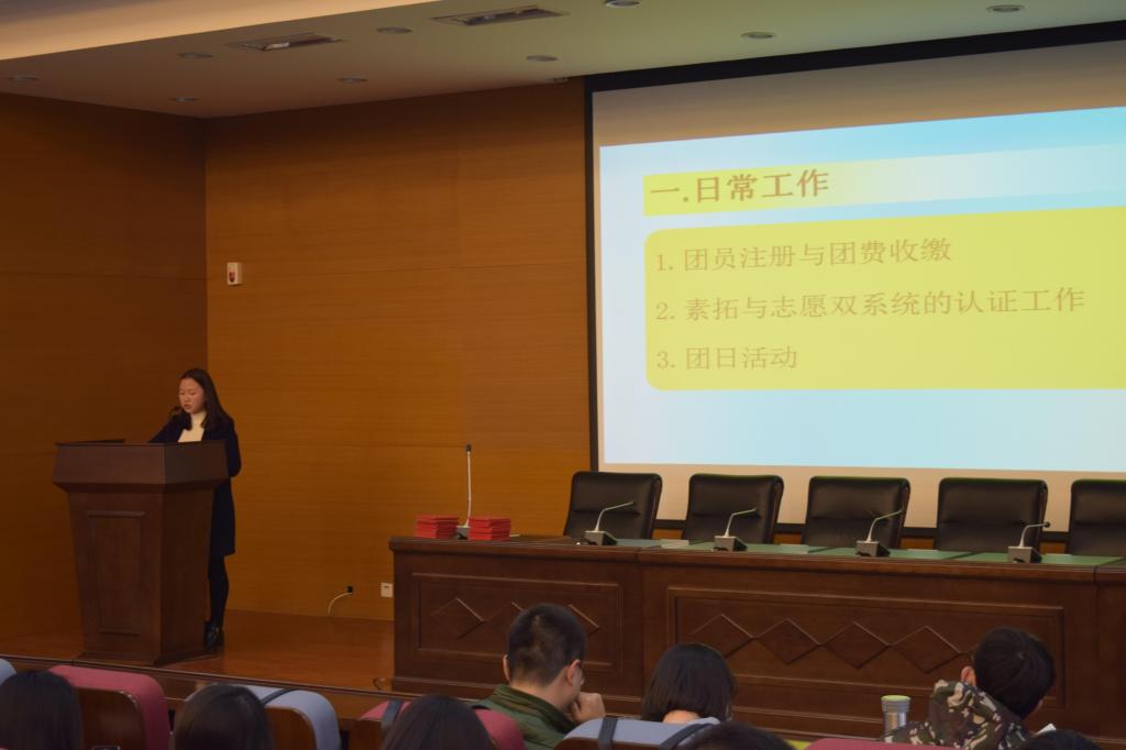 大会进入第一个环节,团委、员工会及各社团负责人进行工作总结汇报。首先,魏宁同学代表团委进行工作总结,她从日常工作、内部管理、校内外活动三个方面讲述了一学期以来团委管理与服务公司、员工所做出的努力,同时也反思了部分活动创新能力的不足,覆盖面不广,希望本学期能在内容与形式上有所创新。接下来胡宝宝同学代表员工会进行工作汇报,从宣传部到文体部,再到学术部与师范部,胡宝宝同学展开了详细讲述,表示各项活动取得了良好的效果,同时希望新一学期的员工会干部再接再厉。之后人文景观考察学会主席骆惺和杏园史学社主席王若粼分别介绍了社团在过去一学期所开展的工作以及新学期社团的工作安排。最后,何生浩同学代表“风追司马”微信工作室进行工作总结汇报,为大家讲述了过去一学期中“风追司马”微信工作室成长的心路历程,表示工作室将继续迎难而上,做出更大的成绩。整个过程,各部门发言人讲解细致、援引数据、不尚空谈、有理有据,与会的同学均表示信服。