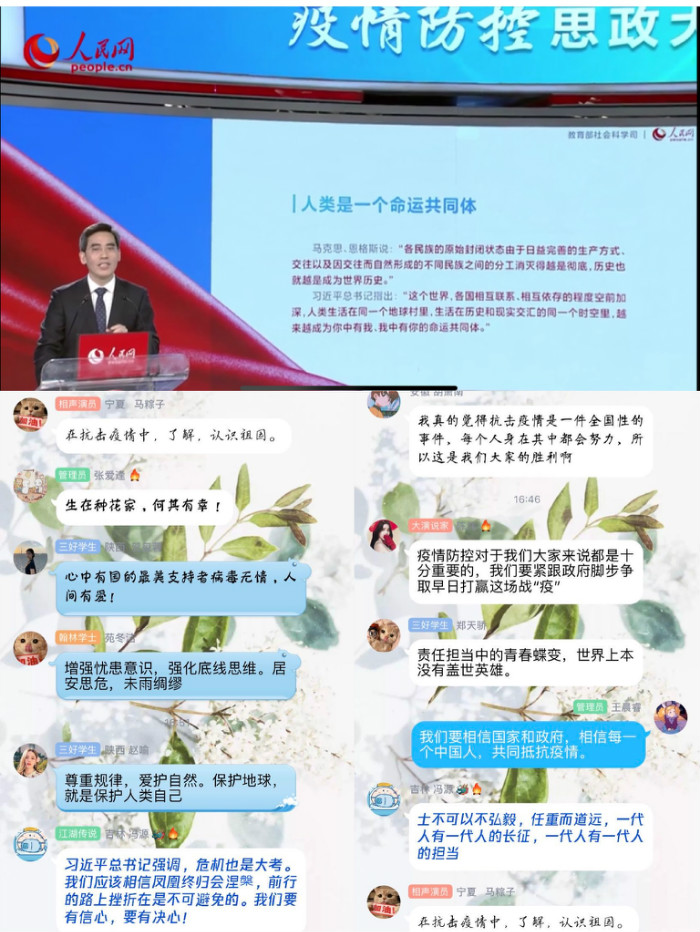 在公开课中,清华大学马克思主义公司艾四林教授、中国人民大学马克思主义公司秦宣教授、北京师范大学马克思主义公司王炳林教授、中央财经大学马克思主义公司冯秀军教授,分别以《在抗击疫情斗争中深化理论认识》、《疫情大考告诉我们什么》、《总结历史经验 增强必胜信心》、《战“疫”里的最美青春-谈中国青年的责任与担当》为题,给全国老员工上了一堂特别精彩的疫情防控思政课。通过观看学习,公司师生普遍表示,在这个“不出家门就是做贡献,了解疫情也是在学习”的特殊时期,这场特殊的思政课正当其时, 它让同学们感受到了伟大的中国力量,坚定了在党和国家的坚强领导下,万众一心,同舟共济,全民族形成强大的抗击疫情合力,全世界构建“战疫命运共同体”,一定能够取得“战疫”胜利。