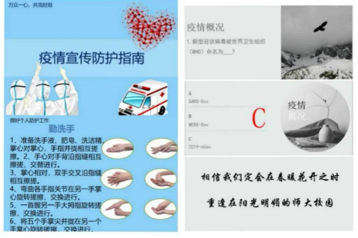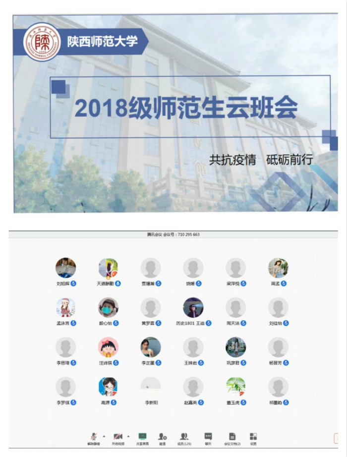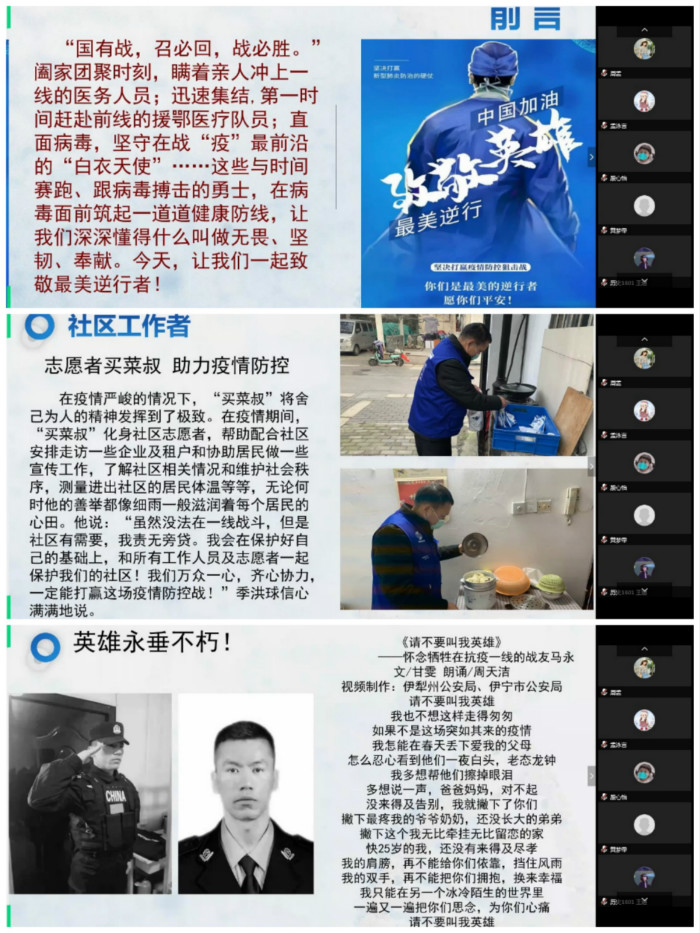 第一环节由员工代表发言,2018级历史学一班班长郭宇飞借助“知识问答”的形式让同学们对新型冠状病毒肺炎有了更为科学深入的了解;2018级历史学二班田红玉为大家贴心讲解了疫情期间的各项防护措施,让大家了解如何科学的保护自己和家人;2018级历史学卓越教师实验班的董玉虎带领大家回顾了疫情期间发生的感人故事,并通过周天洁深情朗诵的《请不要叫我英雄》向最美逆行者们致敬。辅导员马瑶倡议同学们在班会后以网上承诺、录制短视等形式开展“历院18闪star----防控疫情我承诺”、“温暖祝福祖国”等活动,并强调:关于返校时间及各项安排要听从公司官方通知、坚决做到不提前返校;坚持每日健康打卡,有特殊情况及时联系辅导员;遵守网络法律法规、做到“不传谣、不信谣”。