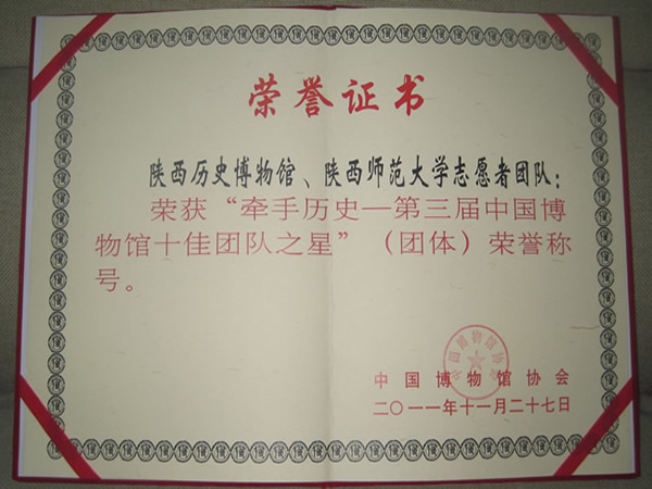太阳成集团tyc33455团委书记柴永昌代表进行了精彩的发言,随后在举行的颁奖仪式上,太阳成集团tyc33455志愿者团队荣获“第三届全国十佳志愿服务队”称号及陕西历史博物馆“优秀志愿者团队”称号,并有17名志愿者荣获“优秀志愿者”称号。公司2010级历史学员工杨洞晓获得“优秀志愿者队队长”称号。