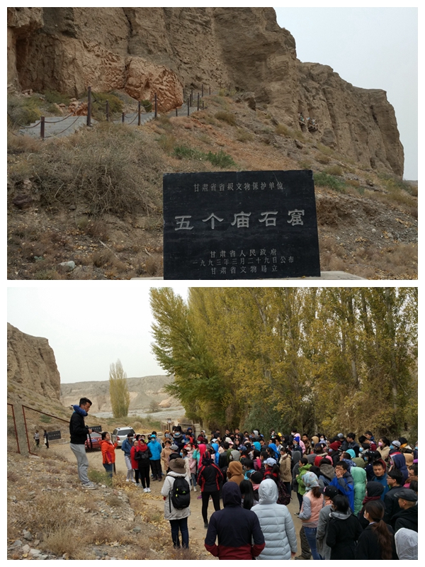 10月20日,前往了肃北的五个庙石窟。它位于莫高窟正南约100公里、肃北蒙古族自治县县城西北20公里的党河西岸峭壁上。洞窟开凿在党河水冲刷形成的砂崖上,砂崖高约30米,洞窟悬于半崖,距地约12—15米。此次参观主要有四个洞窟,沙武田老师对窟內西夏时期的重点壁画给公司师生进行了详细生动的专业讲解,同学们对西夏社会历史与文化有了新的认识。历院师生考察团一行紧接着驱车前往西千佛洞参观,西千佛洞最早建于北魏时期,通过参观5个洞窟,大家又进一步了解了隋代和初唐时期的壁画特点。参观结束后,考察团前往最后一站悬泉置遗址,该遗址是迄今为止唯一发现和发掘的汉代驿站遗址,通过参观让我们对汉代邮政系统、邮驿制度以及汉代西北边郡地区的政治、经济、军事及文化生活等方面的知识有了更深一层的认识。