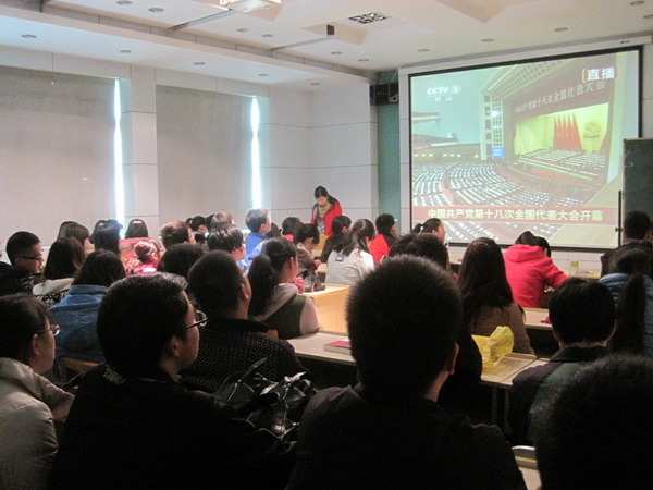 中国共产党第十八次全国代表大会于11月8日上午9时在北京人民大会堂隆重开幕。为深入学习党的“十八大”精神,当日早上九点整,公司党委积极响应公司党委的号召,组织员工党员干部在长安校区文渊楼二层多媒体教室集中观看“十八大”开幕式的现场直播。2010级党支部书记洪海安与同学们一道观看了开幕式的直播盛况。