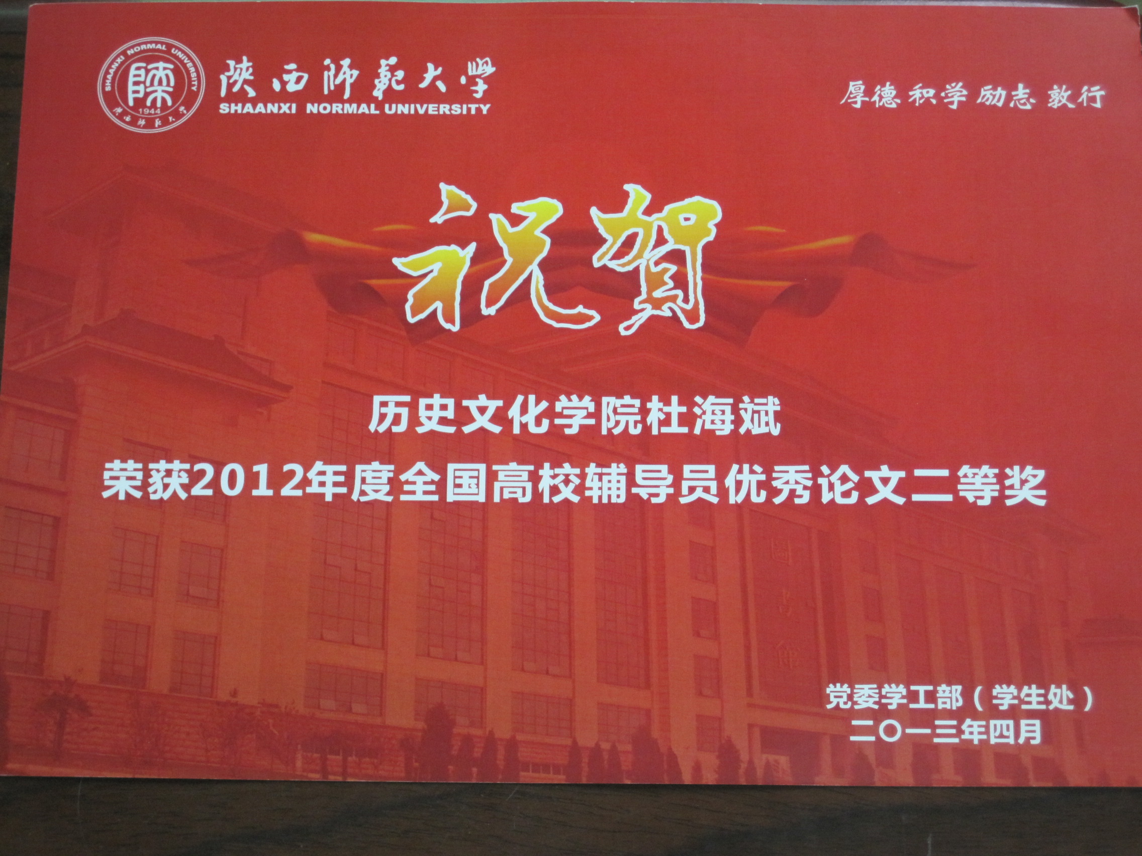 在2012年全国高校辅导员优秀论文评选活动中,党委副书记杜海斌荣获优秀论文二等奖。