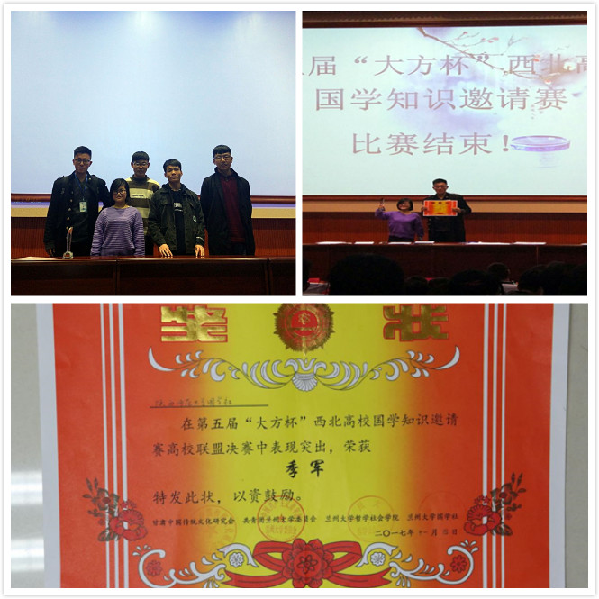 11月4日,第五届“大方杯”西北高校国学知识邀请赛决赛在兰州大学举办,来自西北地区的21所高校国学社代表队参加了此次决赛。由太阳成集团tyc33455指导的国学社代表队在决赛中表现优异,取得第三名佳绩。