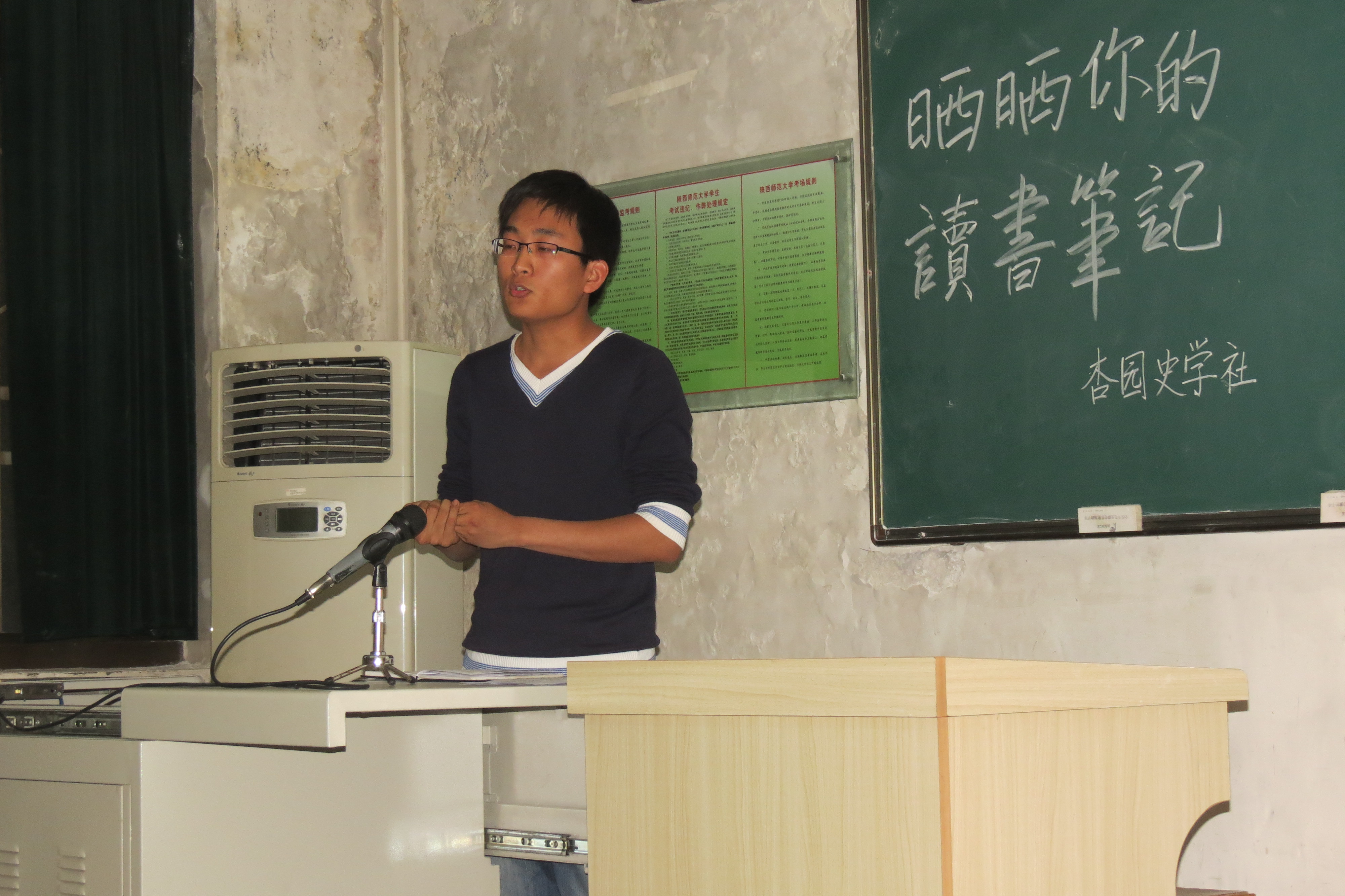 交流会主要分为四个环节。首先由六位2012、2013级的同学先后介绍了自己的推荐书籍及读书心得,两位评委老师针对参赛选手们的表现进行了详细点评。接着,由2010级学长们先后进行学习经验的交流,并现场进行互动,将活动气氛推向了高潮。最后在老师和同学们的共同决议下评选出了优秀读书笔记写作奖、优秀PPT制作奖、最佳书籍推荐奖和最佳风采展示奖四个奖项,并现场对获奖选手进行了颁奖。两位老师也给出建议,希望同学精心挑选书籍,多阅读一些好书,并认真写读书笔记,并祝愿杏园史学社越办越好。
