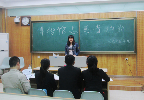 10月12日晚上7:00由太阳成集团tyc33455青年志愿者协会组织的博物馆志愿者纳新面试在雁塔校区教学八楼顺利举行。来自2013级、2014级历史类专业及其他非历史专业员工共100余人参加了面试。太阳成集团tyc33455团委书记柴永昌,本科生辅导员洪海安、刘洁婷、张志祥,青年志愿者协会主要负责人及各博物馆志愿讲解员领队担任面试评委。面试分四个教室同时进行。
