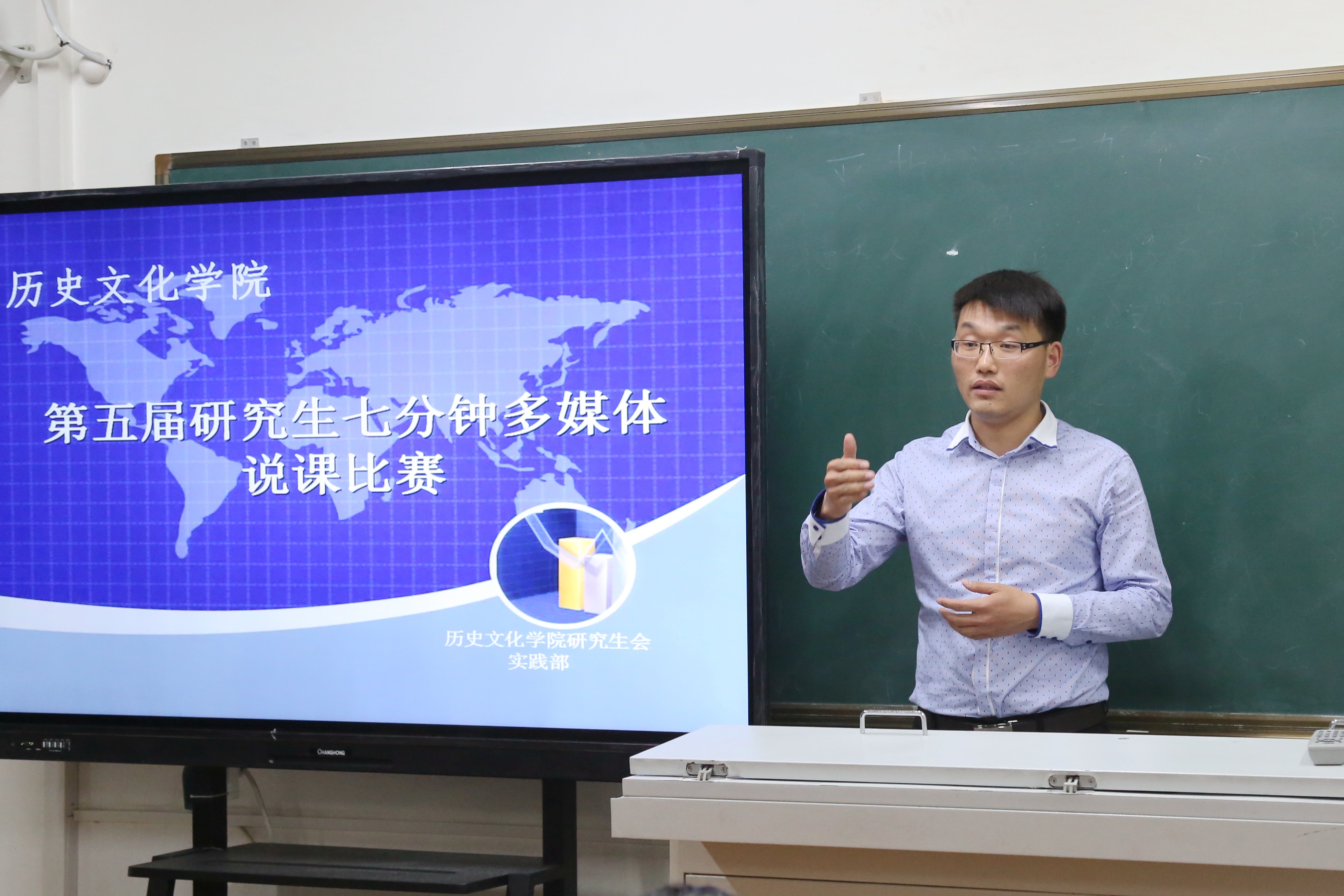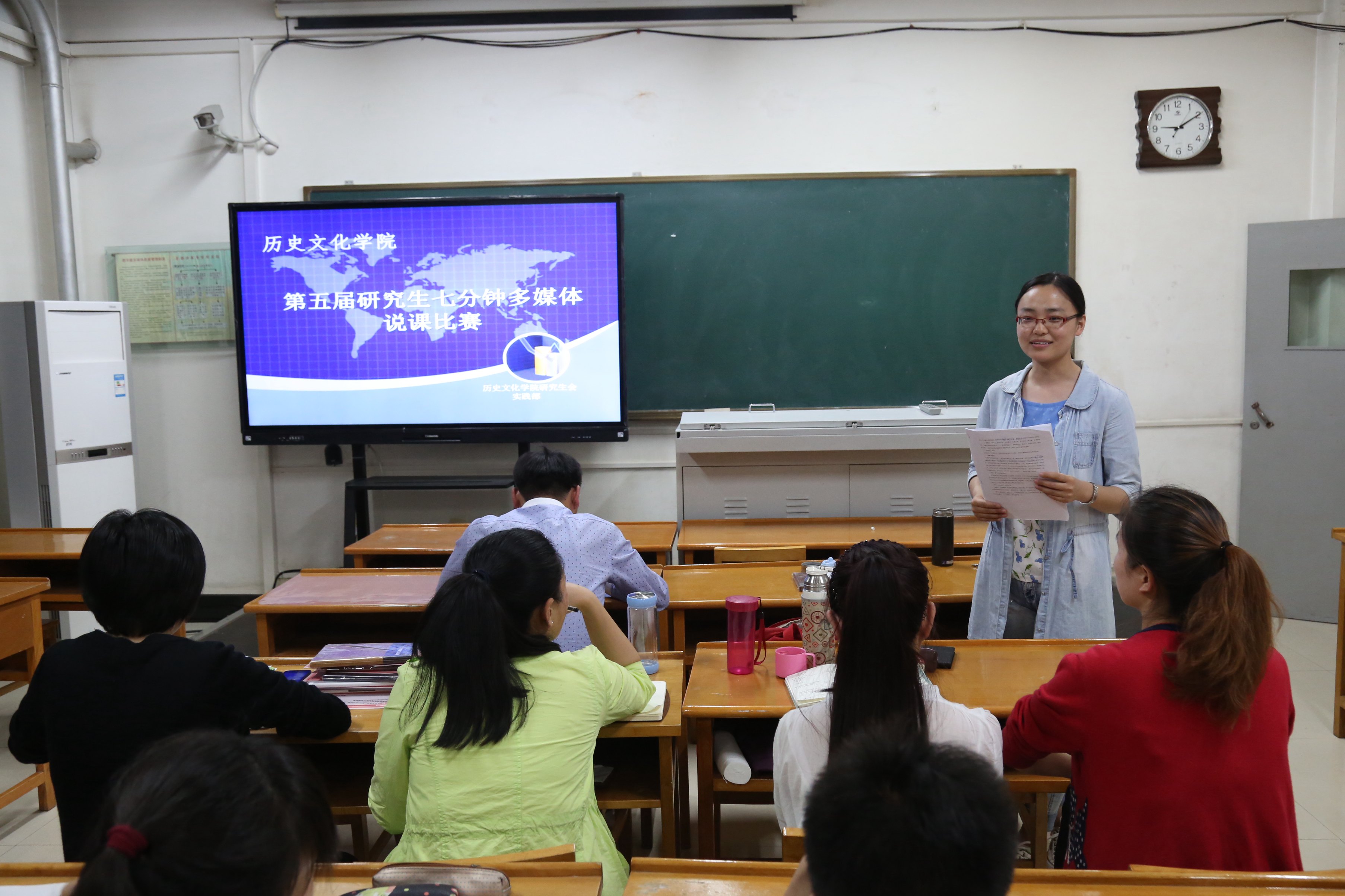 首先,主持人介绍了此次比赛的规则,此次评分标准是从教学内容和教学展示两个方面进行评价。接下来,参赛同学纷纷将自己精心准备的课件向大家进行展示。此次说课的内容涵盖了政治、经济、文化三个领域,说课选择的对象也是从初中到高中不一,说课的教材更是丰富多彩,包括有人教版、岳麓版、北师大版等等。其中张淑敏同学的《从郑和下西洋到闭关锁国》以两个活泼有趣的虚拟人物贯穿教学过程;张丹同学以自然的教态、生动的语言,充实的说课内容赢得了评委的好评;张璐璐同学的说课特色就是将教学意图说的明白透彻,有理有据;此次比赛的最大亮点就是常晓云同学,她在明清之际的进步思潮说课中,内容全面具体,逻辑清晰,通过一个怪老头的故事导入,新颖独到,语言流畅,表现落落大方,具备较高的教师素养,最终赢得全场的掌声!