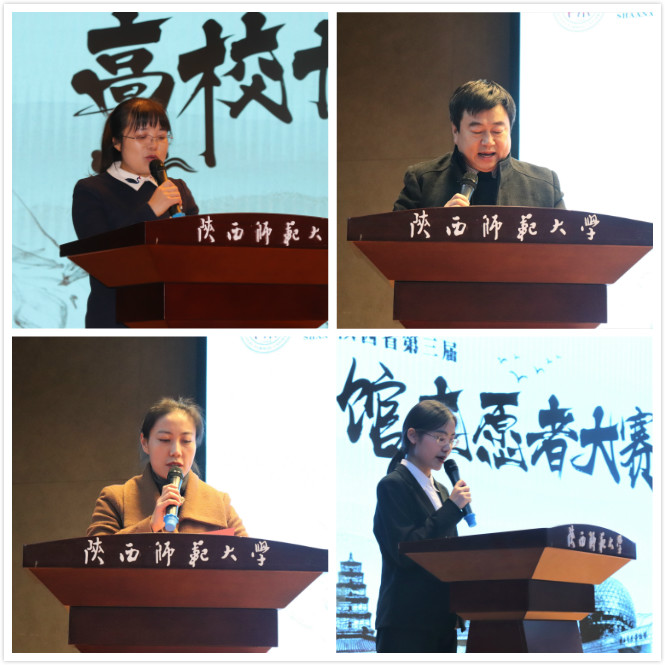 开幕式上,李娟在致辞中强调,陕西历史展示出的是华夏文明的独特魅力,需要青年人秉承薪火相传、代代守护的精神,学好历史知识、懂得传播传承、讲清文化自信,用爱心传承文明、用真情奉献社会、用行动实现诺言。石洛祥指出,公司把学科教育与博物馆志愿服务实践相结合,在加强员工综合素质的同时,也提高了高校员工在社会服务方面的责任感与使命感。戴璐以习近平总书记“青年一代有理想、有担当,国家就有前途、民族就有希望”重要讲话为号召,要求高校博物馆志愿者们做好传播文明的使者、展示形象的使者和传承历史的使者。志愿者代表李戈扬代表参赛选手承诺,将永葆初心,践行志愿精神,更好的为文物、为历史代言。