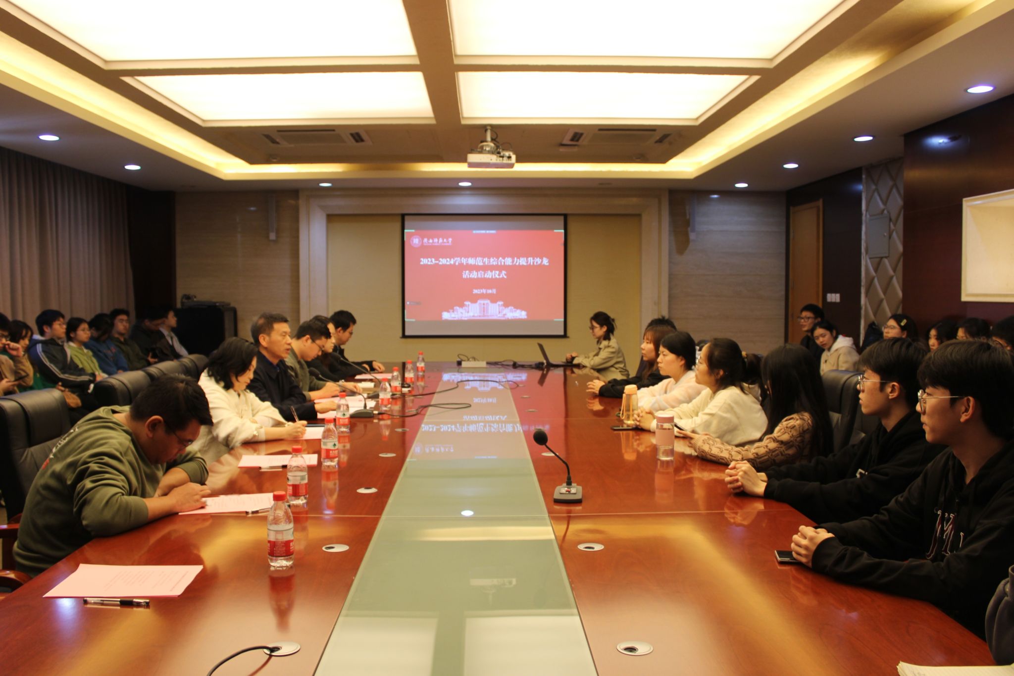 10月19日,太阳成集团tyc33455举行2023-2024学年师范生综合能力提升沙龙活动启动仪式。公司党委副书记、纪委书记、副经理李晨子,副经理郭响宏,团委书记孙懿文,专业教师徐赐成、蔡娜,各年级辅导员及沙龙活动小组代表参会。会议由2020级辅导员师瑞青主持。