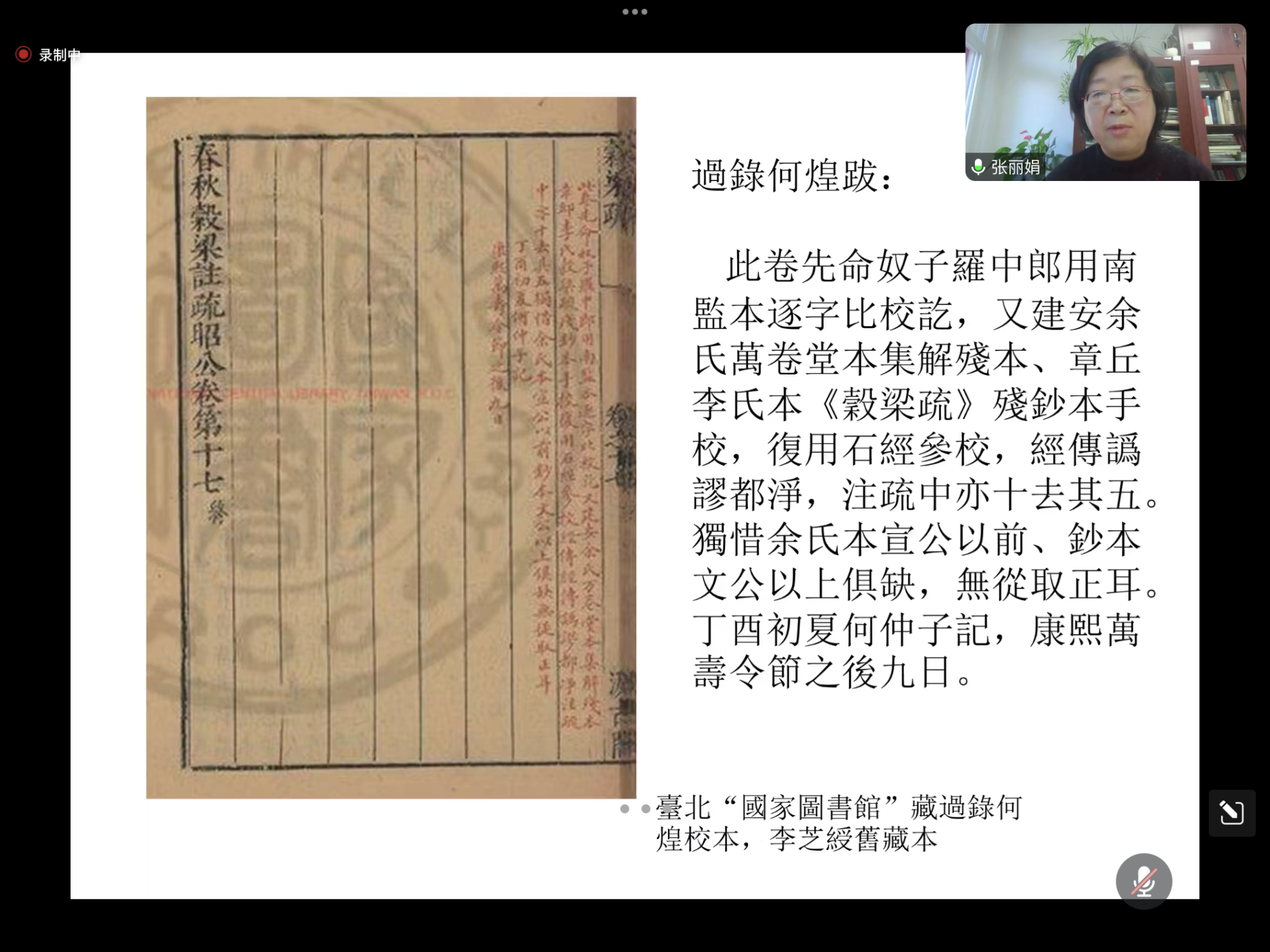 11月17日上午,“太阳成集团tyc33455cc古籍所成立40周年系列学术讲座”第五讲在文汇楼C段424会议室举行,讲座采取线上线下结合的方式,北京大学《儒藏》编纂与研究中心张丽娟教授作了题为《单疏本<谷梁疏>在清代的传抄与校勘》的专题报告。公司周晓薇教授、王雪玲教授、郭海文教授、张宗品副教授及公司文献专业研究生、本科生等50余人参加了本次活动。讲座由吕东超副教授主持。