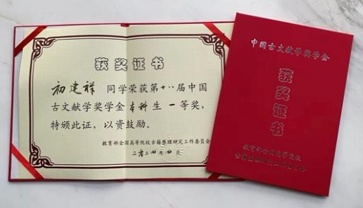 在中国古文献学奖学金的评选中,本科生一等奖每届仅设两名。初建祥同学在本次评比中脱颖而出,获得全国一等奖,实属难能可贵。这是我专业从2013年来参与中国古文献学奖学金评选以来第一次获此殊荣!充分体现了高校古委会对我们本科生培养工作的高度肯定,极大鼓舞了我们今后努力进步的信心,亦说明公司古文献专业对员工专业基础的学术训练卓有成效。本次评奖将激发我们再接再厉,努力学习其他院校在培养本、硕、博人才方面的长处,认真反思并改正我们的缺点和不足。