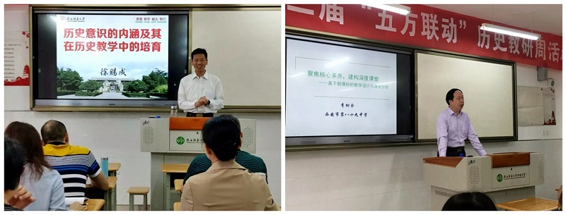 公司副教授徐赐成老师进行了题为《历史意识的内涵及其在历史教学中的培育》的讲座,徐老师从“历史意识”基本问题、“历史学习”再理解等角度出发,引用大量文献与专家学者关于历史意识的观点看法,强调历史教育工作者须加强对历史意识的关注和重视。关于历史学科的五大学科素养,徐老师认为历史课堂需要以唯物史观、史料实证、时空观念为工具,运用历史解释来达到实现家国情怀的效果。西安八十九中特级教师李树全老师带来了题为《聚焦核心素养,构建深度课堂——基于新课标的教学设计与课例分析》的讲座,李老师从当前现状讲起,提出要追求“有意思有意义”的历史教学,并运用经典课例阐释课堂需要立意、材料、问题、人物、逻辑五大要素,认为历史教育需要给予员工多元的思考,历史材料决定教学的厚度。